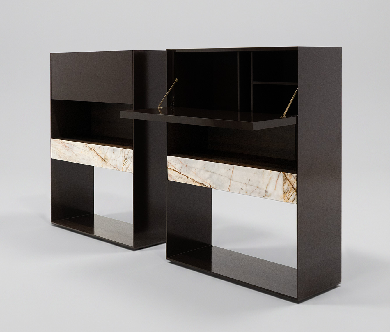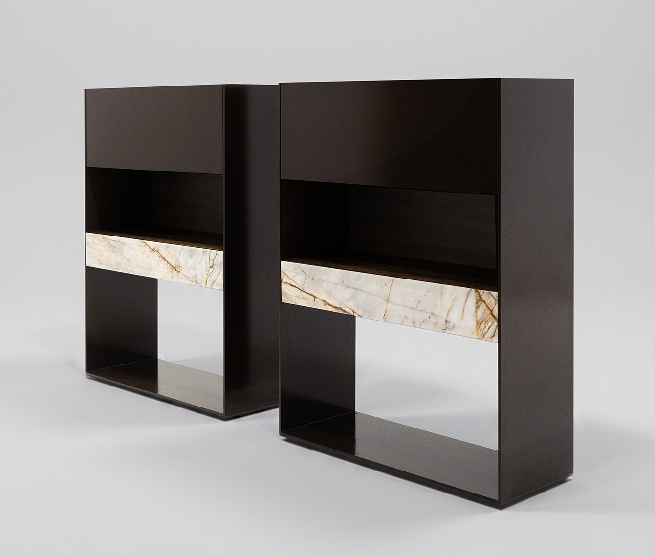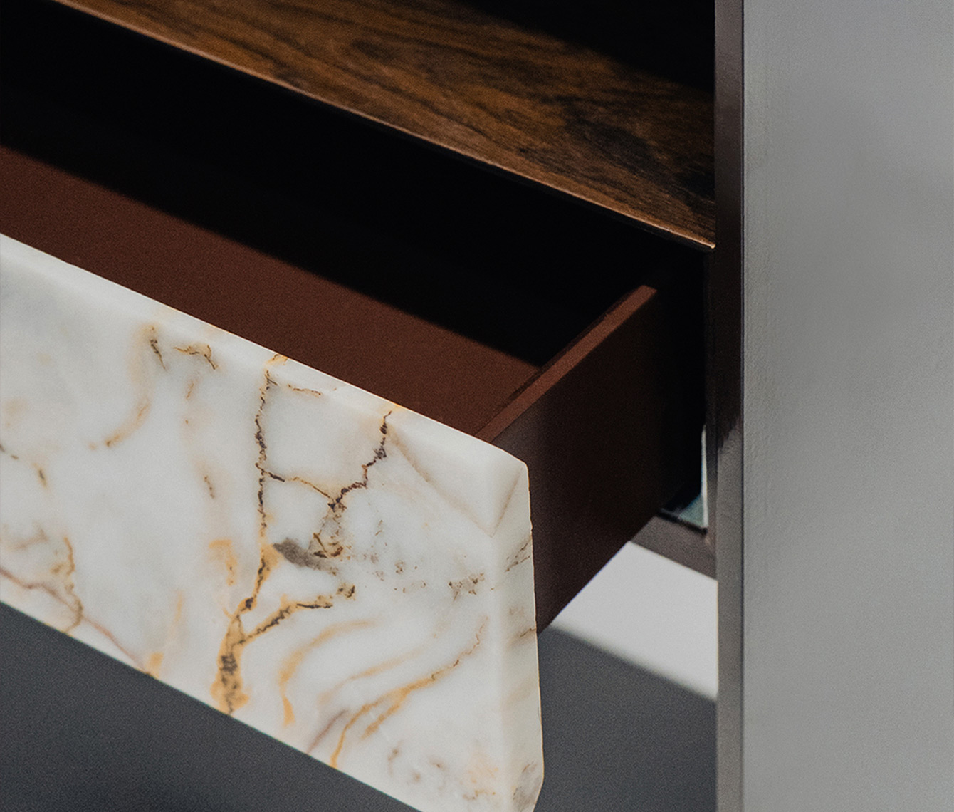 Prisma de rigurosa geometría, juego de sostén y sostenido sobre una línea metálica que define su exterior. Este contenedor en equilibrio de personalidad brillante contrasta con un interior funcional cálido natural.