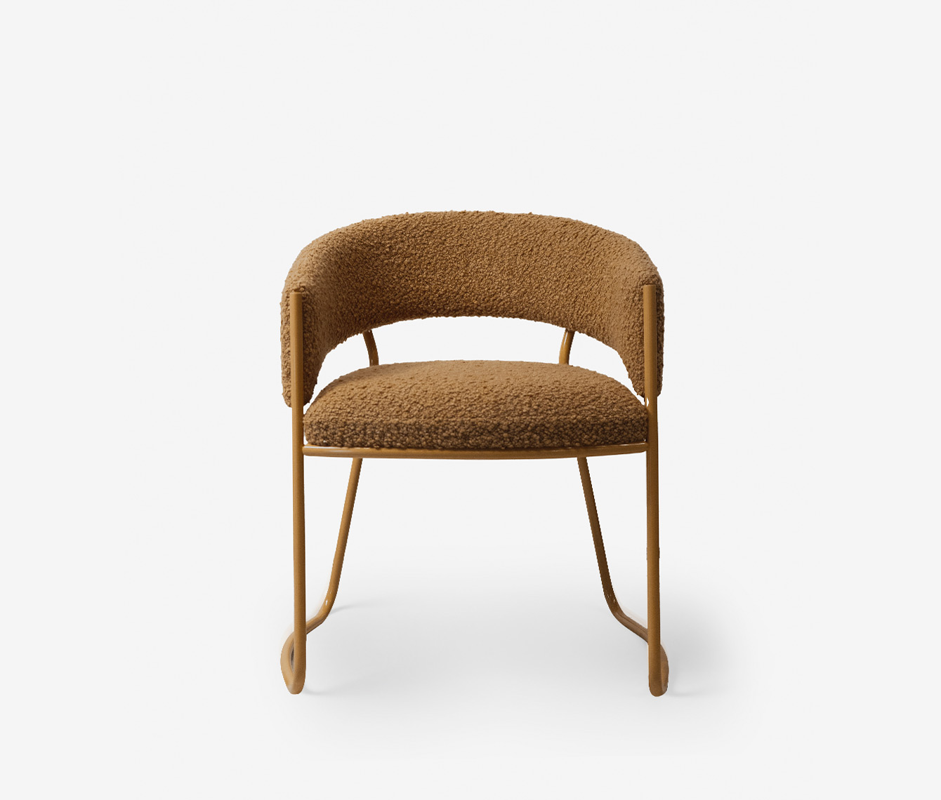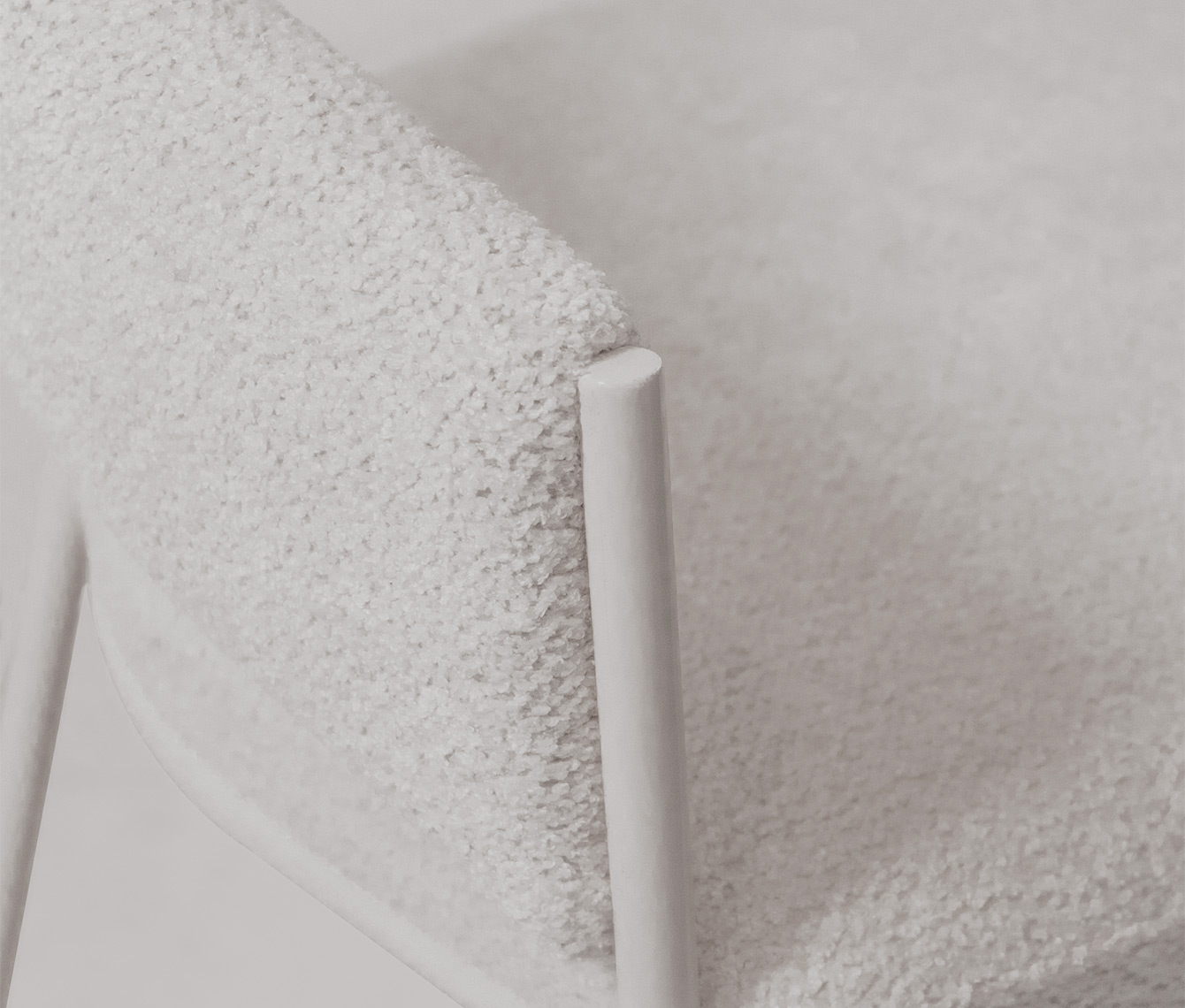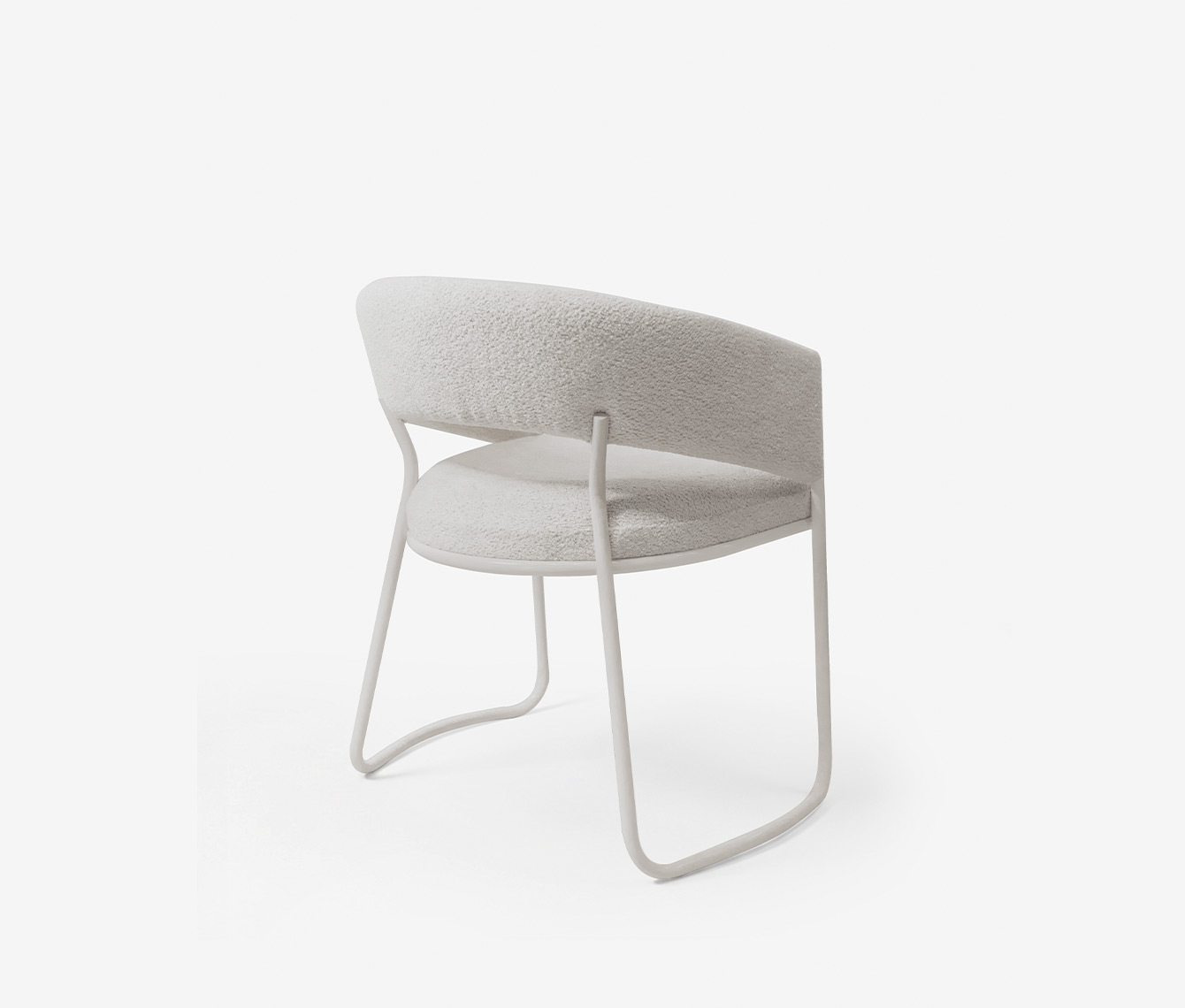 Caracterizada por una silueta liviana y envolvente, su estructura juega con un contraste poético: los elementos tapizados parecen flotar, suspendidos por un fino hilo metálico que los abraza y sostiene con una gracia casi invisible.