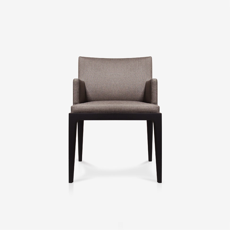 Silla Tribeca, de líneas simples y estudiada proporción. El encastre resuelve la unión de la estructura base de madera maciza y el tapizado.